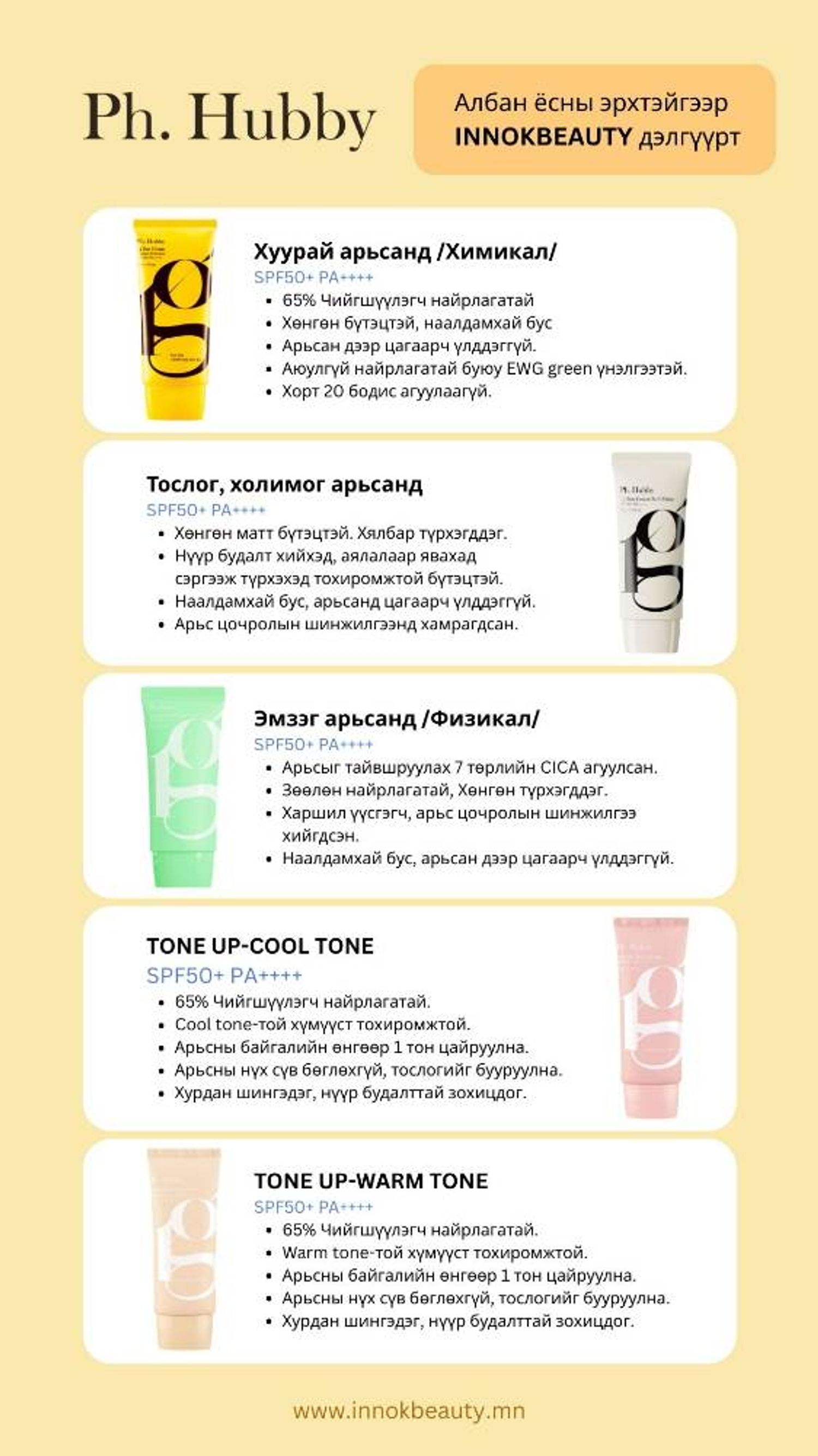 Ph.HubbyТослог, холимог арьсанд тохиромжтой. Хөнгөн матт бүтэцтэй. Хялбар түрхэгддэг. SPF50+ PA++++